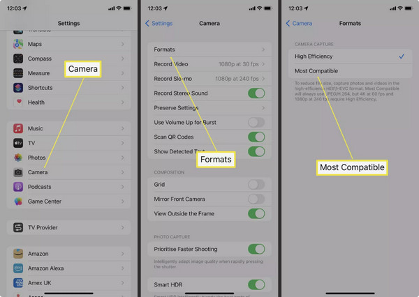 Adım 2.Çektiğiniz fotoğraflarınızı JPG'ye kaydetmek için Biçim düğmesine ve ardından "En Uyumlu" düğmesine dokunun.