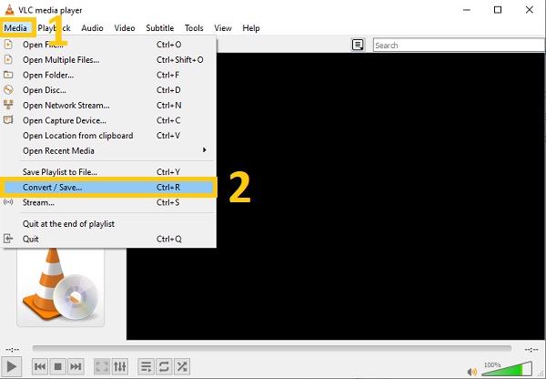 步驟1。從 VLC 網站下載並安裝與您的裝置相容的 VLC 軟體版本,然後啟動它。然後,轉到“媒體”選單,螢幕上將出現選項清單。從那裡,您必須點擊“轉換/儲存”按鈕或點擊鍵盤上的“Ctrl + R”按鈕。